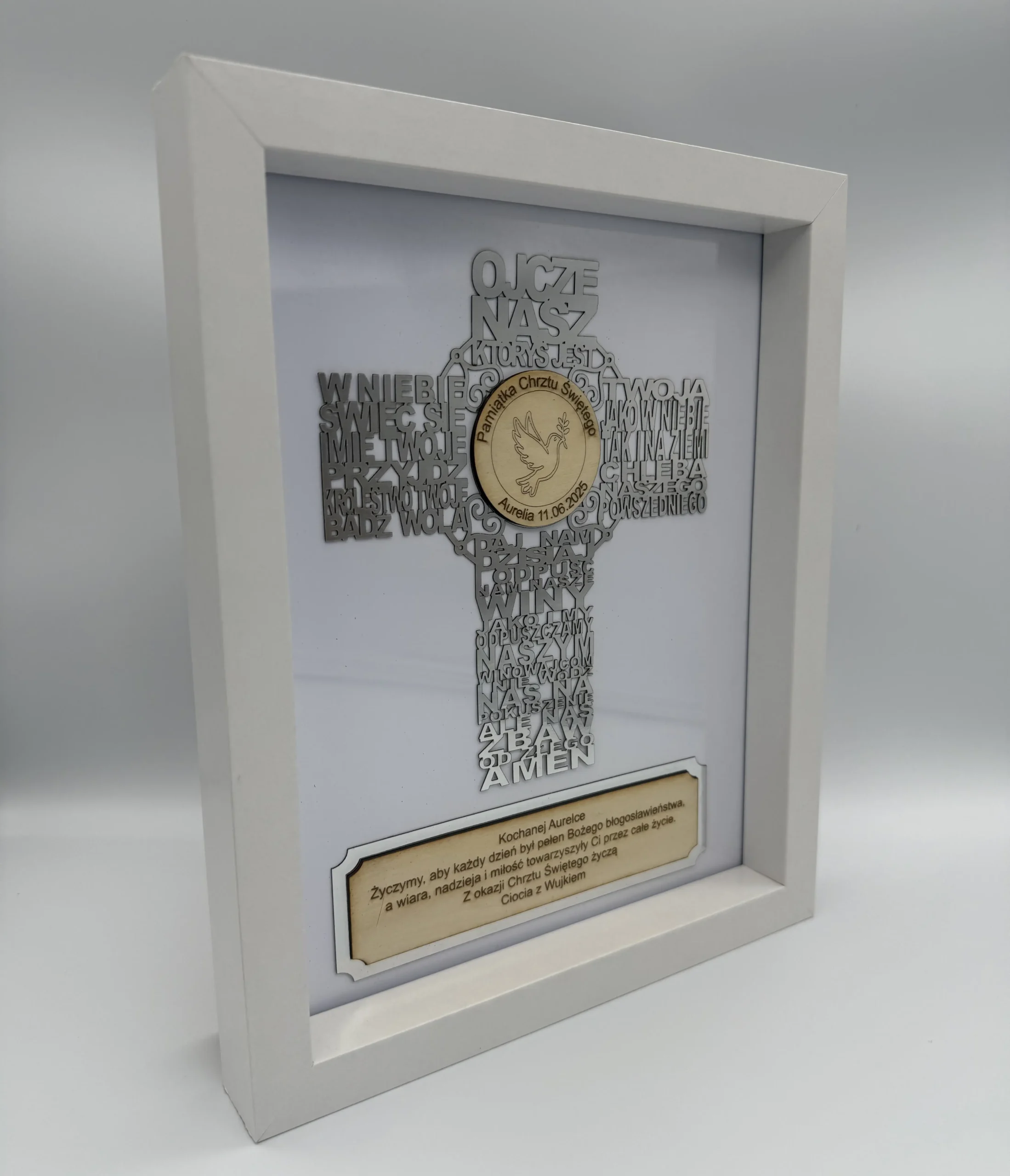 Delikatne i eleganckie pamiątki Chrztu Świętego w formie krzyża z modlitwą w ramce. Na krzyżu znajduje się symbol gołębicy oraz napis „Pamiątka Chrztu Świętego” z miejscem na imię i datę.