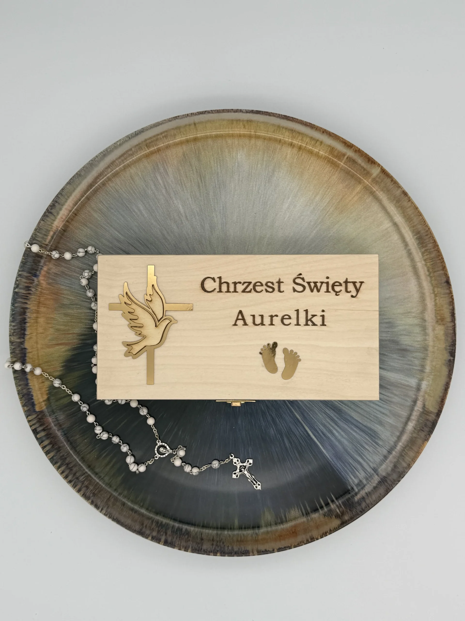 DREWNIANA SZKATUŁKA NA CHRZEST ŚWIĘTY Z GRAWEREM