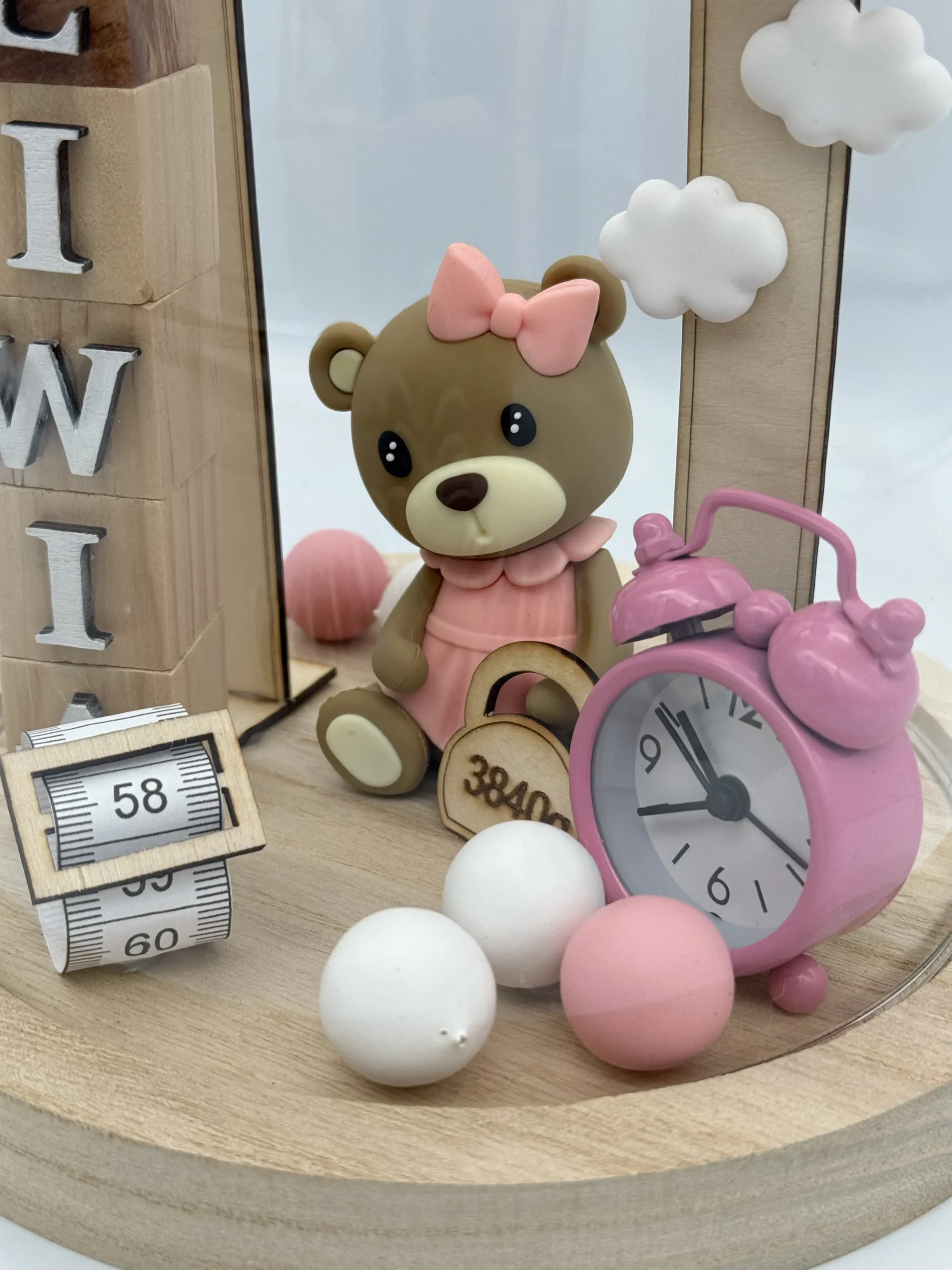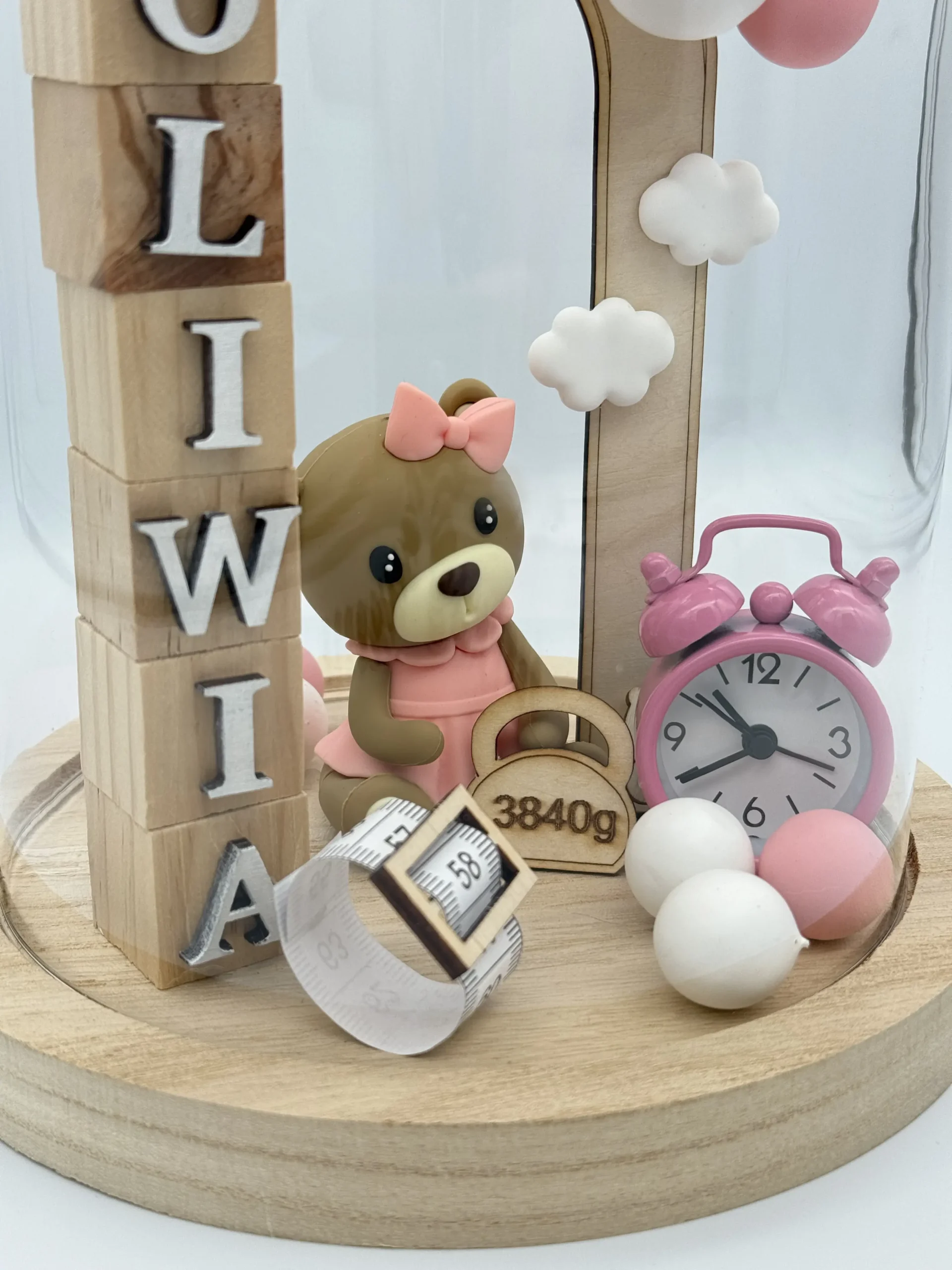 Wyjątkowa personalizowana metryczka dla dziecka w formie eleganckiej szklanej kopułki na drewnianej podstawce.