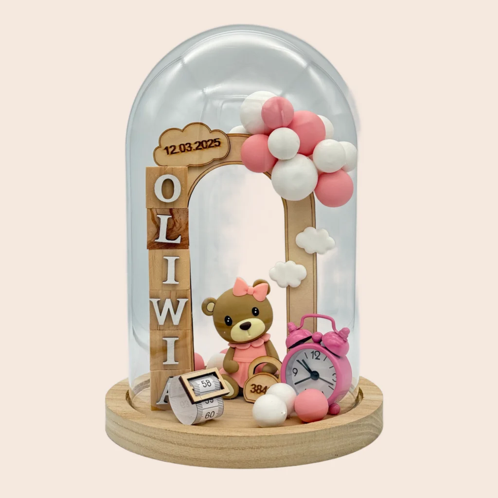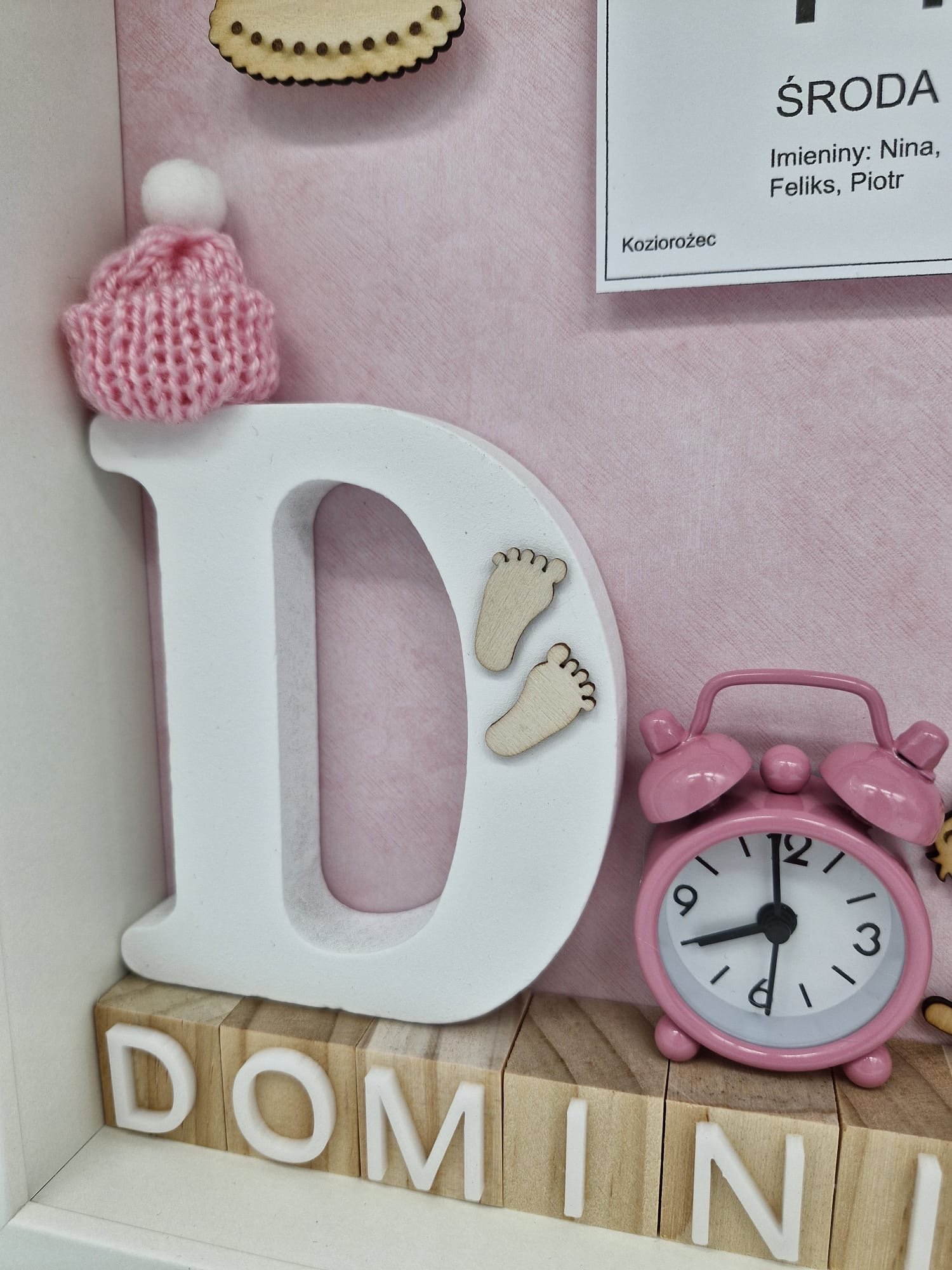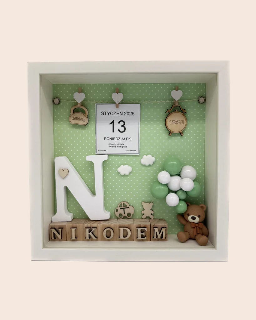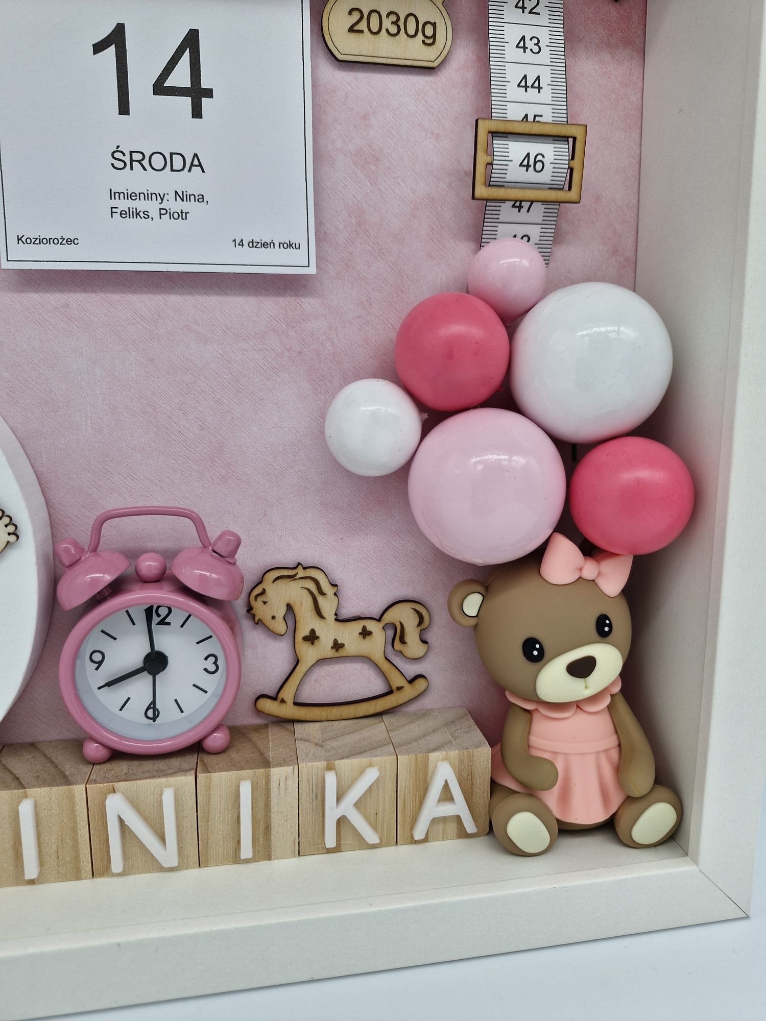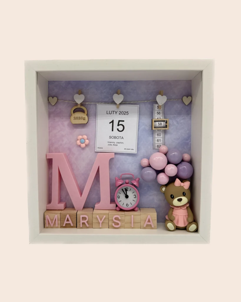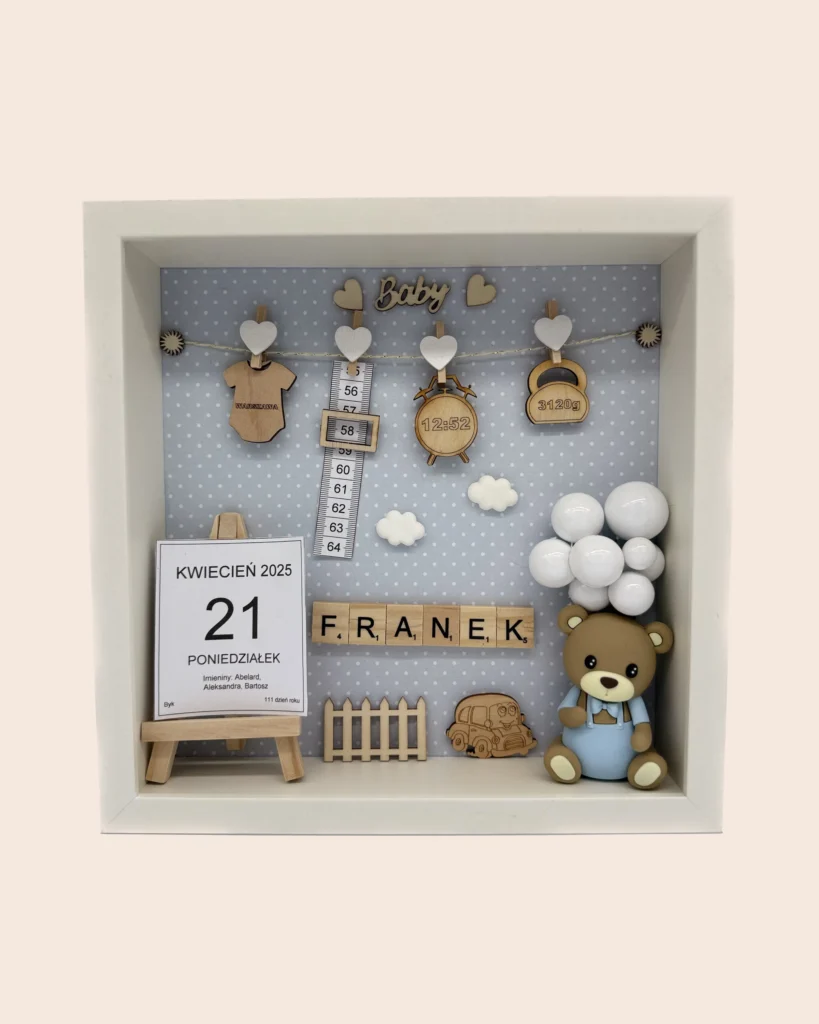 Elegancka personalizowana ramka metryczka dla dziecka – wyjątkowy prezent na narodziny, urodziny, roczek lub chrzest. W środku ramki znajduje się słodka figurka misia oraz elementy pamiątkowe: data urodzenia, godzina, waga i długość dziecka, wszystkie w oryginalnej formie graficznej (waga – ciężarek, długość – centymetr, czas – mały budzik). Całość dopełniają kolorowe baloniki i drobne ozdoby.